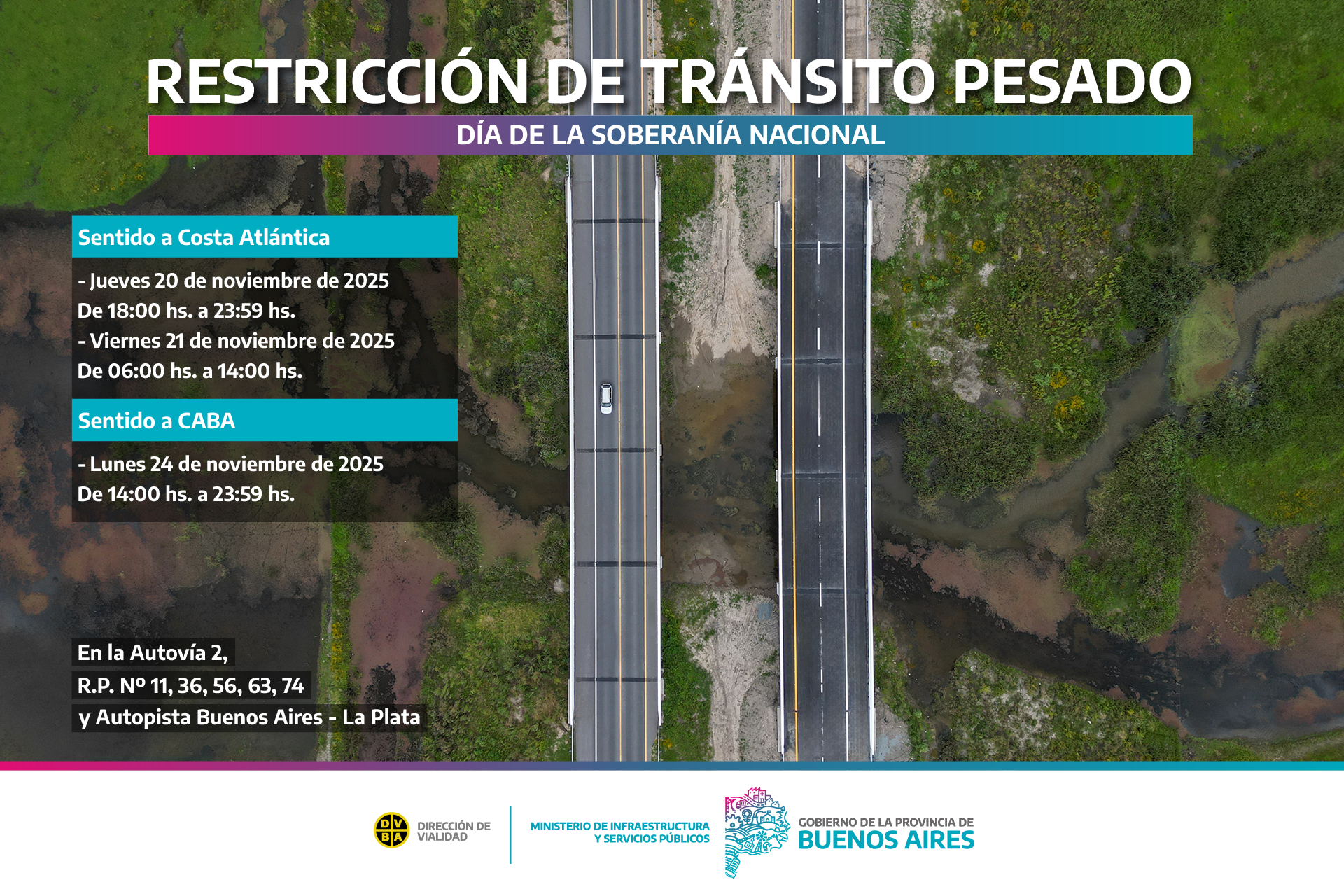 Será en la Autovía 2, Rutas Provinciales Nº11, 36, 56, 63, 74 y Autopista Buenos Aires–La Plata.