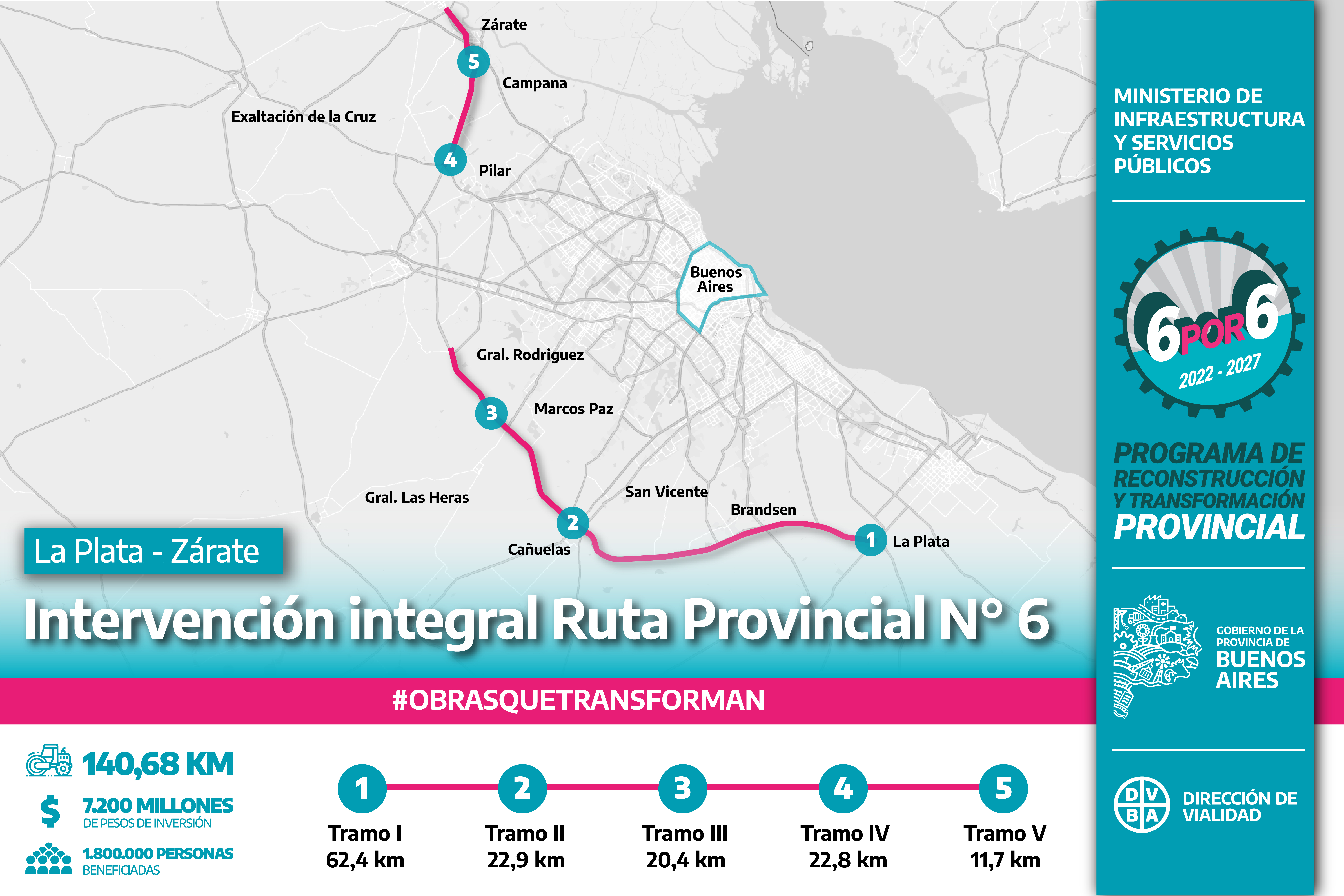 La primera etapa contempla la repavimentación de los tramos con mayor deterioro y rehabilitación de las calzadas que se encuentran en mejor estado. Además, la puesta en valor de puentes, iluminación y señalización horizontal, vertical y aérea. Los trabajos se realizarán a lo largo de 140 km de extensión atravesando 11 municipios: La Plata, Brandsen, San Vicente, Cañuelas, Gral. Las Heras, Marcos Paz, Gral. Rodríguez, Campana, Exaltación de La Cruz, Pilar y Zárate. Esto beneficiará no sólo a los 1,8 millones de habitantes de esos municipios, sino también a quienes circulen por esta ruta que conecta dos puertos.