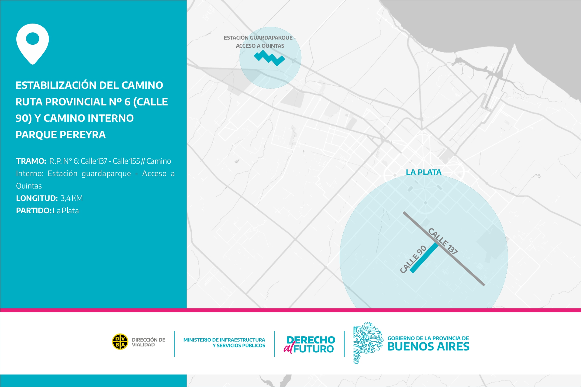 Se trata de la obra del estabilizado de la Ruta Provincial Nº6, en el tramo que inicia en la calle 137 y finaliza en la calle 155, y al camino interno Parque Provincia Pereyra Iraola, en el tramo que inicia en el Puesto de Guardaparques y culmina en el Establecimiento de Producción Hortícola.