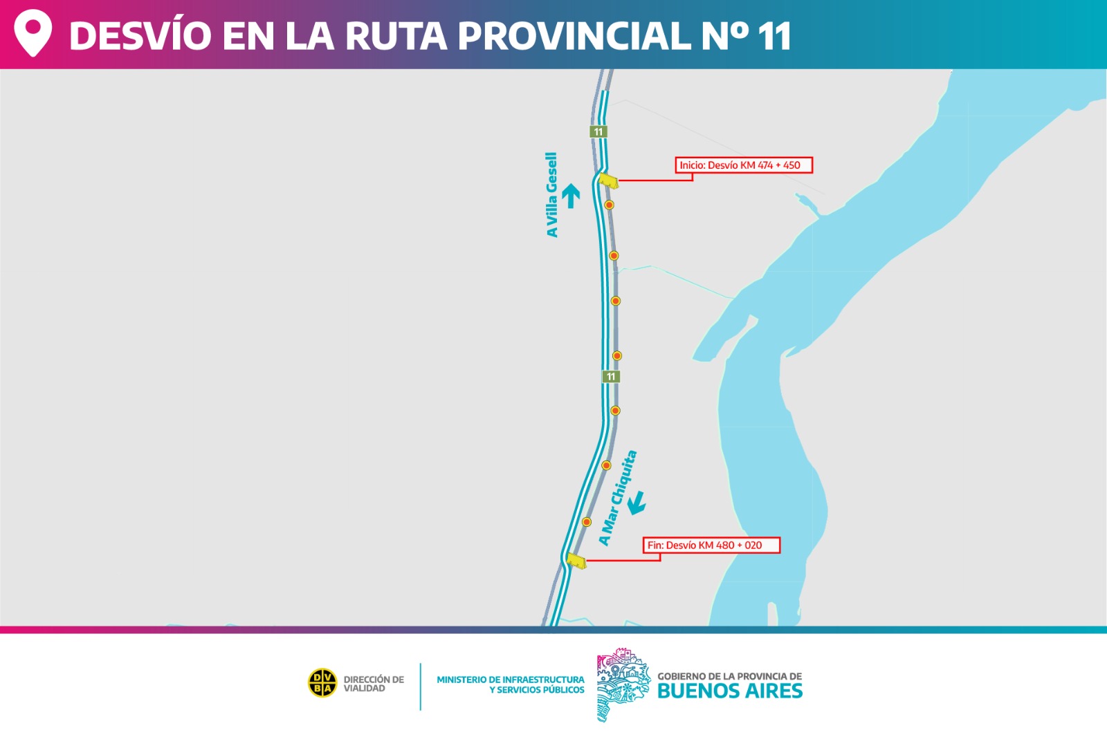 La Dirección de Vialidad de la provincia de Buenos Aires -dependiente del Ministerio de Infraestructura y Servicios Públicos- comunica que, debido a la construcción de la segunda calzada en la Ruta Provincial Nº 11, se generarán cortes y desvíos en el tránsito.