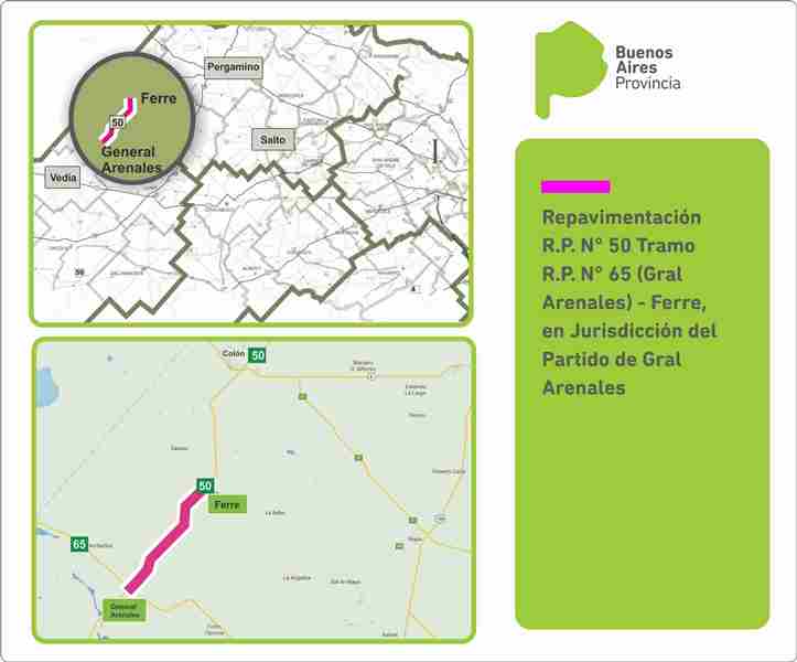 La Licitación Pública 20/2016 contempla la obra Repavimentación Ruta Provincial N° 50, tramo Ruta Provincial N° 65 (General Arenales) y Ferré, cuyos trabajos consisten en la repavimentación de la calzada asfáltica en una longitud de 28.000 metros, reconstrucción de losas de hormigón en rotonda intersección con Ruta Provincial N° 65 y en intersección con acceso a Ferré, como así también, la señalización horizontal y vertical en todo el tramo. Estas obras demandan al Gobierno provincial una inversión de más de 200 millones de pesos.