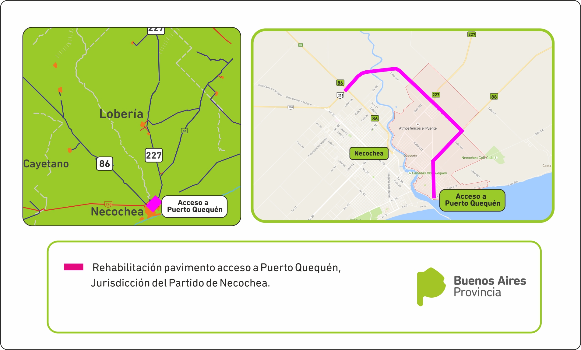 A través de la Licitación Pública 37/2016, se realizarán los trabajos viales en el acceso a puerto Quequén, cuyos tramos a intervenir son: Ruta 88, entre Rotonda Avenida Circunvalación y Avenida Almirante Brown; Avenida Almirante Brown entre Ruta 88 y Acceso a Puerto Quequén (altura Avenida 502); Avenida Circunvalación entre Ruta 88 y Ruta 228; Ruta 86 entre calle 44 y Avenida 58; y, Puente Taraborrelli, sobre Río Quequen entre Ruta 228 y Avenida Circunvalación.