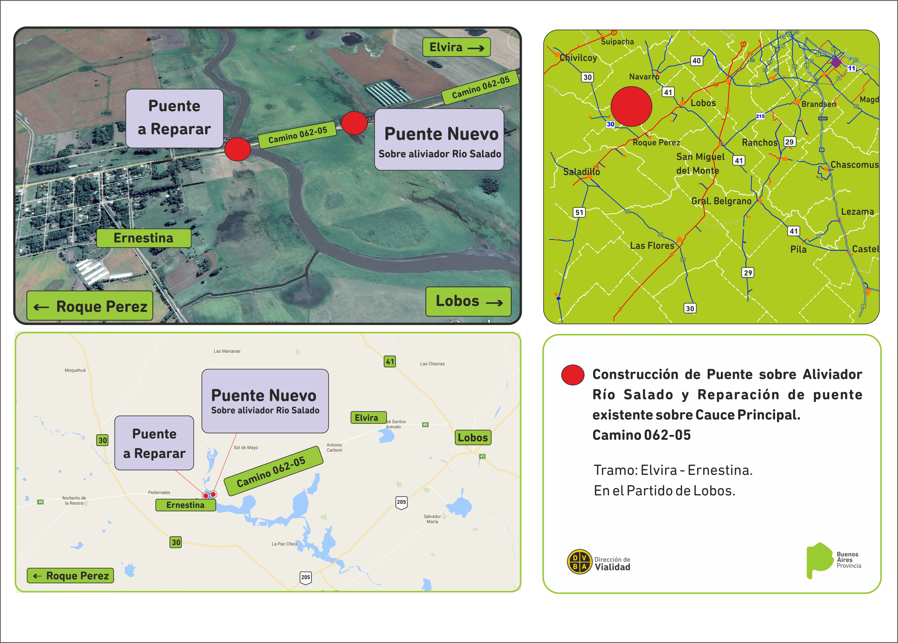 Asimismo, la Provincia licitó –por una monto de más de 22 millones de pesos– la construcción del puente sobre aliviador Río Salado y reparación del puente existente sobre cauce principal en el Camino 062-05 que une Elvira y Ernestina, en el partido de Lobos. La obra consiste en el reemplazo del puente provisorio -tipo Bailey- por un nuevo puente tipo viga y la reparación del estribo del puente existente de hormigón armado sobre el cauce principal (lado Elvira).